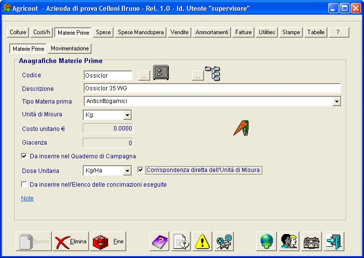 Questa sezione permette di caricare in Agricont le informazioni principali per ciascuna Materia Prima (Anticrittogamici, antiparassitari, concimi, diserbanti, materiali di consumo, ecc) utilizzato all'interno dell'Azienda. Un esempio per capirme l'utilità: una materia prima deve essere scaricato nella stessa Unità di misura (UM) con la quale è stato scaricato.Se avete acquistato una materia prima in Kg, ed avete compilato l'apposito campo in questa Sezione, durante la registrazione degli scarichi verrà sempre visualizzata l'UM con cui registrare lo scarico, evitando quindi l'errore di scaricarlo, ad es., in Litri.