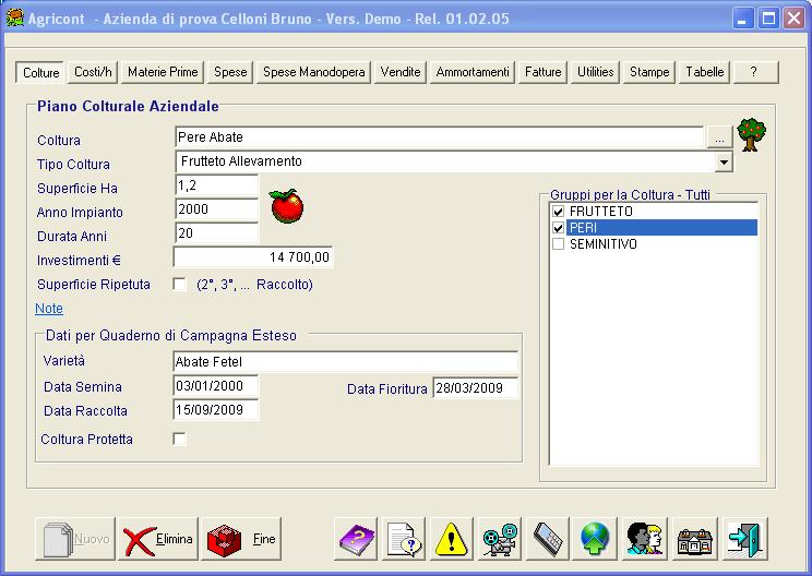 Nell'immagine precedente la coltura Pere Abate è stata inserita in 2 gruppi: Frutteto e Peri. Quando si esegue la trinciatura dell'erba su tutto il frutteto sarà registrata una sola operazione colturale sul Gruppo Frutteto. Quando si esegue un'operazione solo sul Pereto, indipendentemente dalla varietà (ad es. un trattamento) la si registrerà appunto sul gruppo Peri.
