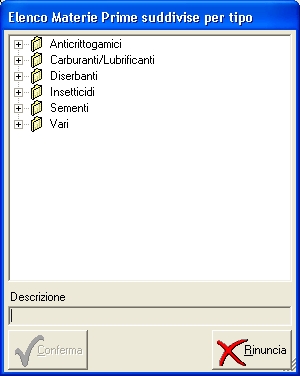Sebbene sembri non avere un'applicazione, il campo è usato per raggruppare le Materie Prime per tipo nelle finestre di selezione ad albero (vedi esempio di seguito). Questo ne permette una rapida individuazione indipendentemente dal numero di elementi presenti. Il campo è configurabile da un'apposita voce nella Sezione Tabelle o, senza spostarsi dalla videata corrente, premendo il tasto destro del mouse e selezionando la voce Aggiungi Elemento.